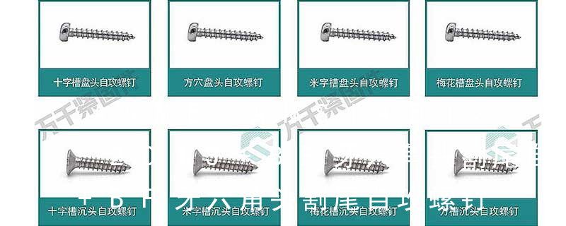 1.机螺钉 2.自攻螺钉 3.钻尾螺钉 4.墙板钉 5.纤维板钉 6.木螺钉7.六角木螺钉 8.不脱出螺钉 9.组合螺钉 10.微型螺钉 11.家具螺钉 12.电子螺钉头型:1.六角头(hexagon head) 2.六角头法兰面(hexagon head with flange) 3.方头(square head) 4.T形头T head (hammer head)5.扁圆头mushroom head(